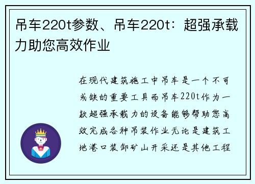 吊车信息平台是一个专门为吊车行业打造的信息交流平台,旨在为用户提供吊车相关的新闻资讯、市场行情、技术交流、产品展示和交易服务。通过吊车信息平台,用户可以及时了解行业动态,找到合适的吊车产品和服务,实现信息共享和交流,促进吊车行业的健康发展。