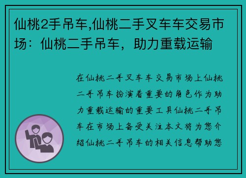 在仙桃二手叉车车交易市场上,仙桃二手吊车扮演着重要的角色。作为助力重载运输的重要工具,仙桃二手吊车在市场上备受关注。本文将为您介绍仙桃二手吊车的相关信息,帮助您更好地了解这一市场。